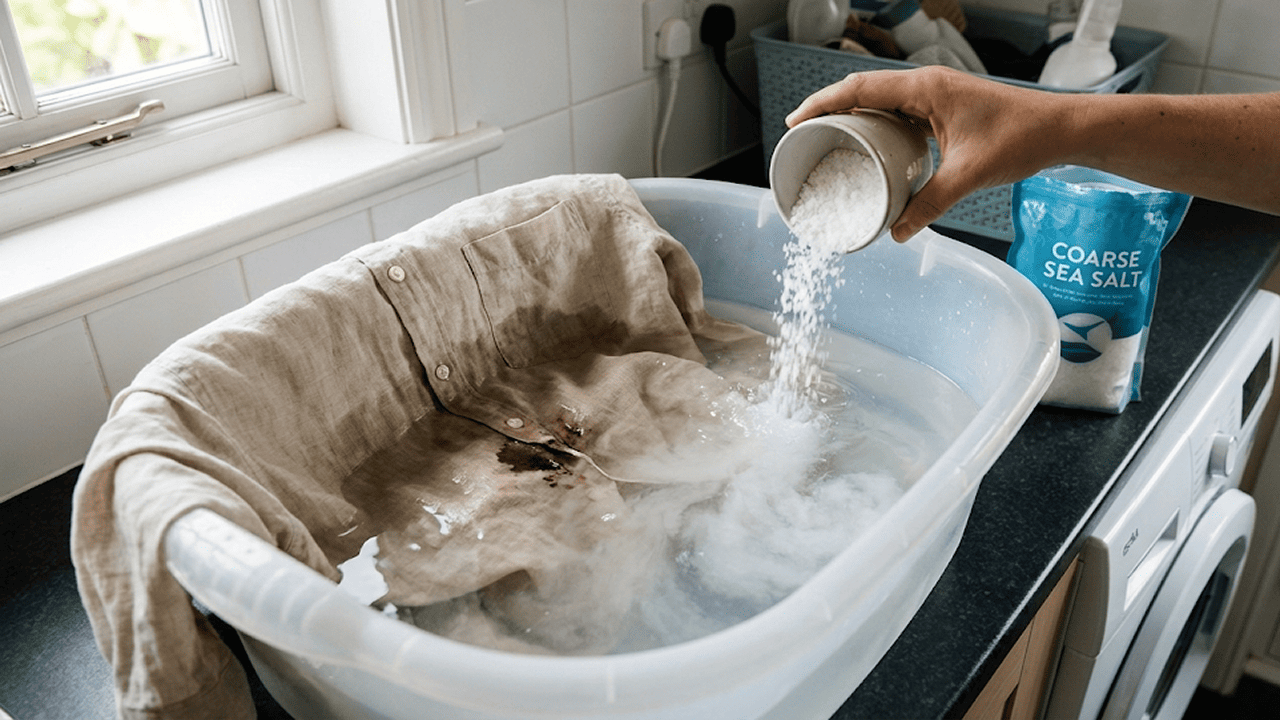 Schritt 2: Einweichen über Nacht Bereite ein Salzbad vor (5 EL Salz pro Liter kaltes Wasser). Lege das Kleidungsstück komplett hinein und lass es mindestens 8 Stunden, besser über Nacht einweichen.