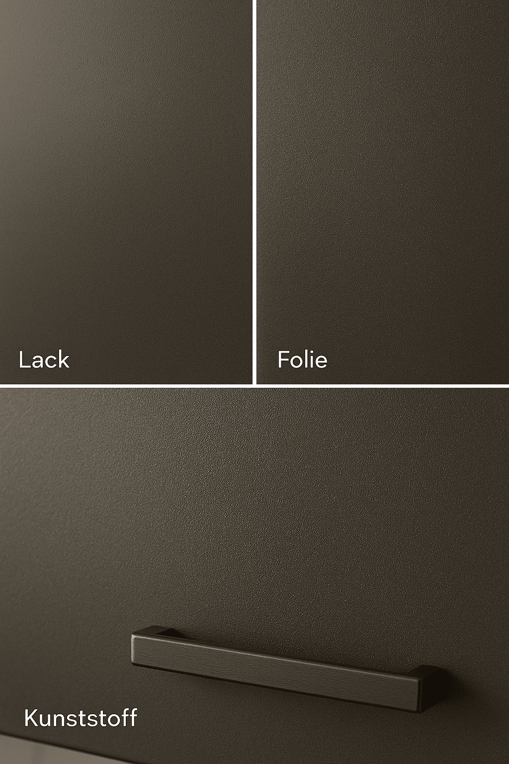 Folienfronten sind mit einer dünnen Dekorfolie überzogen, die auf eine Trägerplatte aufgebracht ist. Sie sind günstiger als Lackfronten, aber auch empfindlicher – besonders an den Kanten.