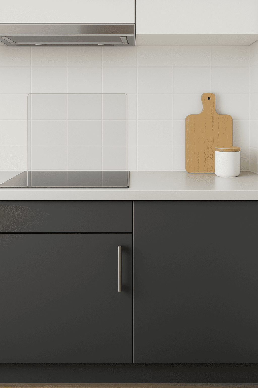 Eine Spritzschutz-Folie oder eine Glasplatte hinter dem Herd fängt die meisten Fettspritzer ab. Das spart dir viel Putzarbeit.