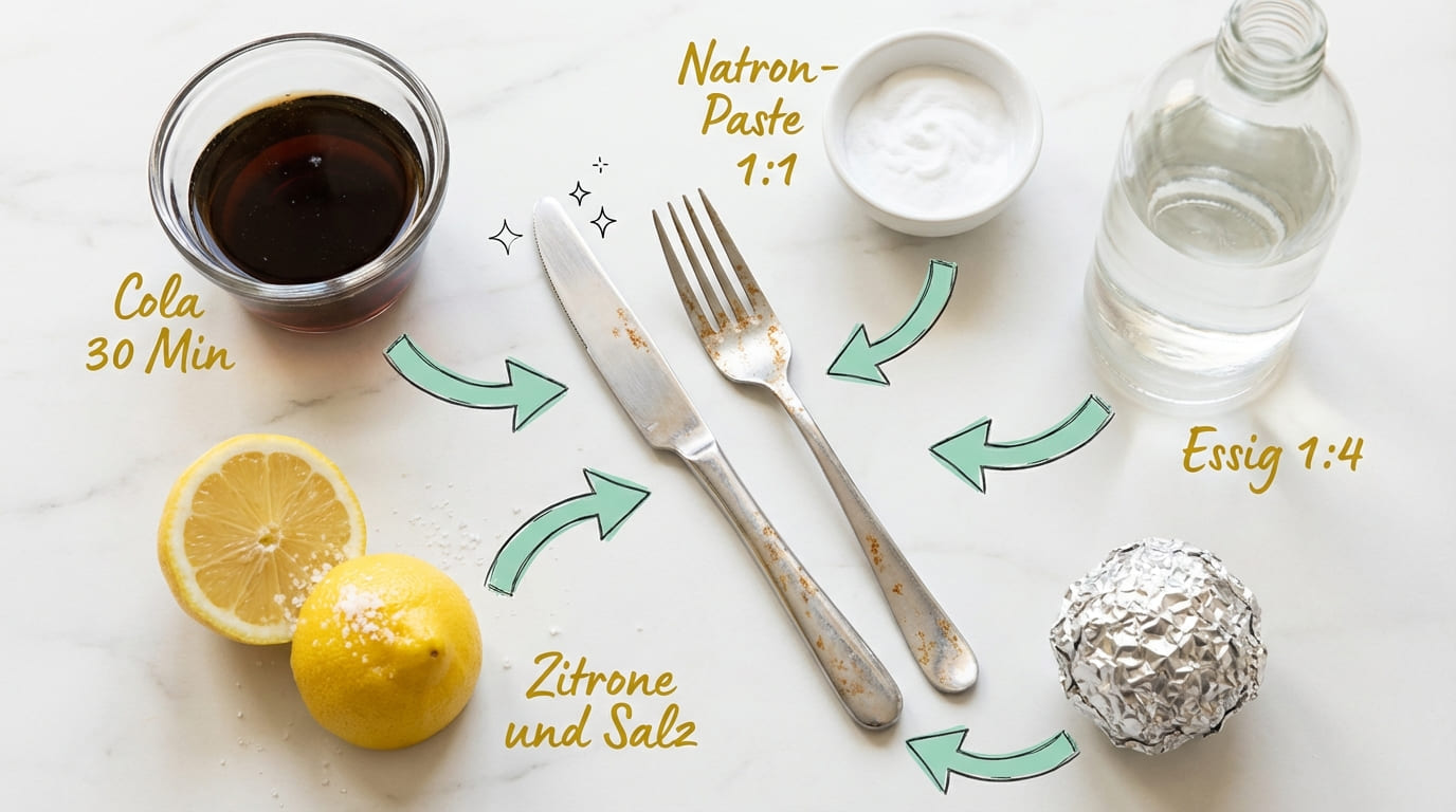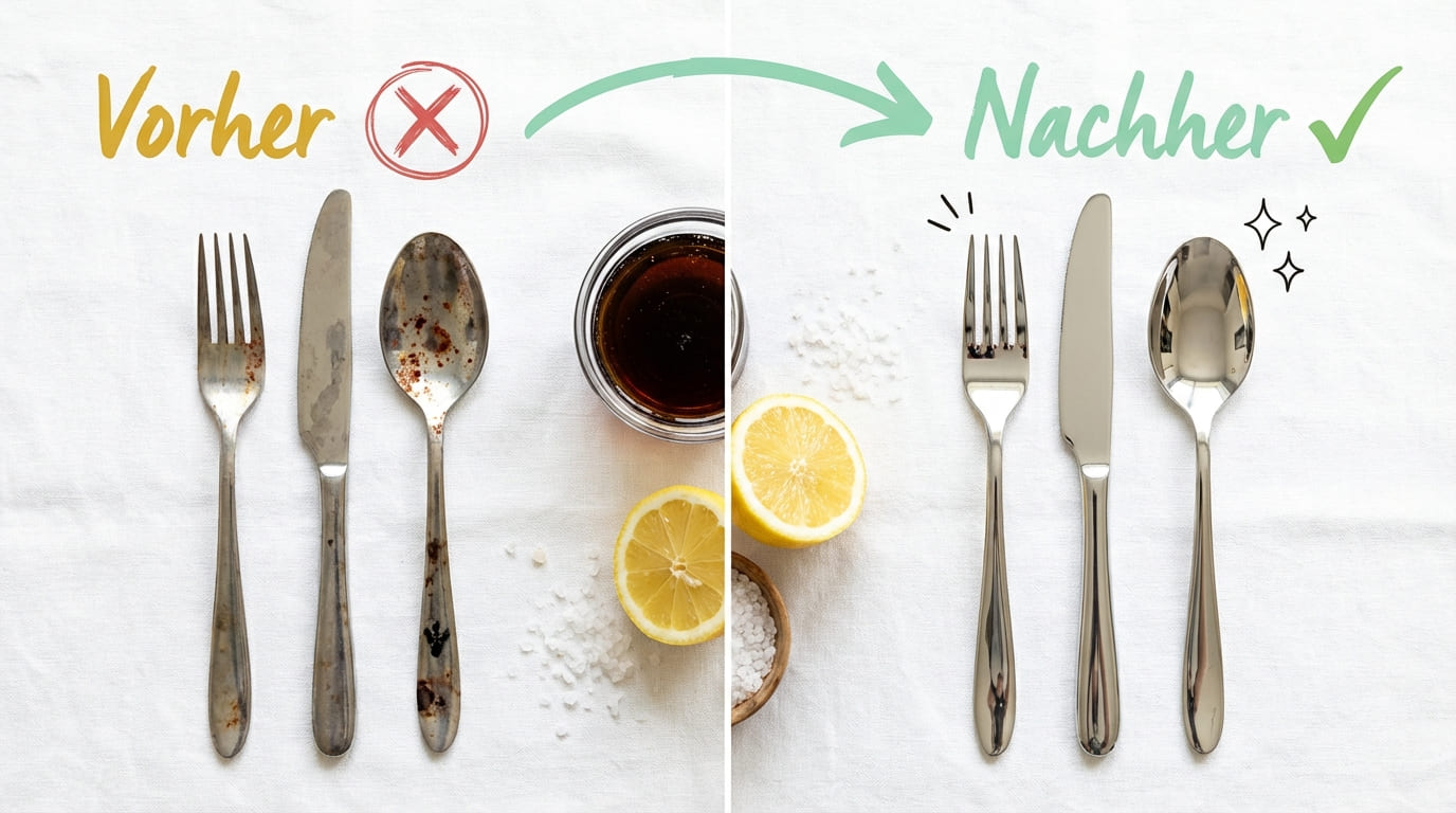 Wichtig: Nicht jede Methode eignet sich für jedes Besteck. Deshalb findest du unten einen Material-Guide als Tabelle und eine ehrliche Einschätzung, wann Hausmittel an ihre Grenzen stoßen.