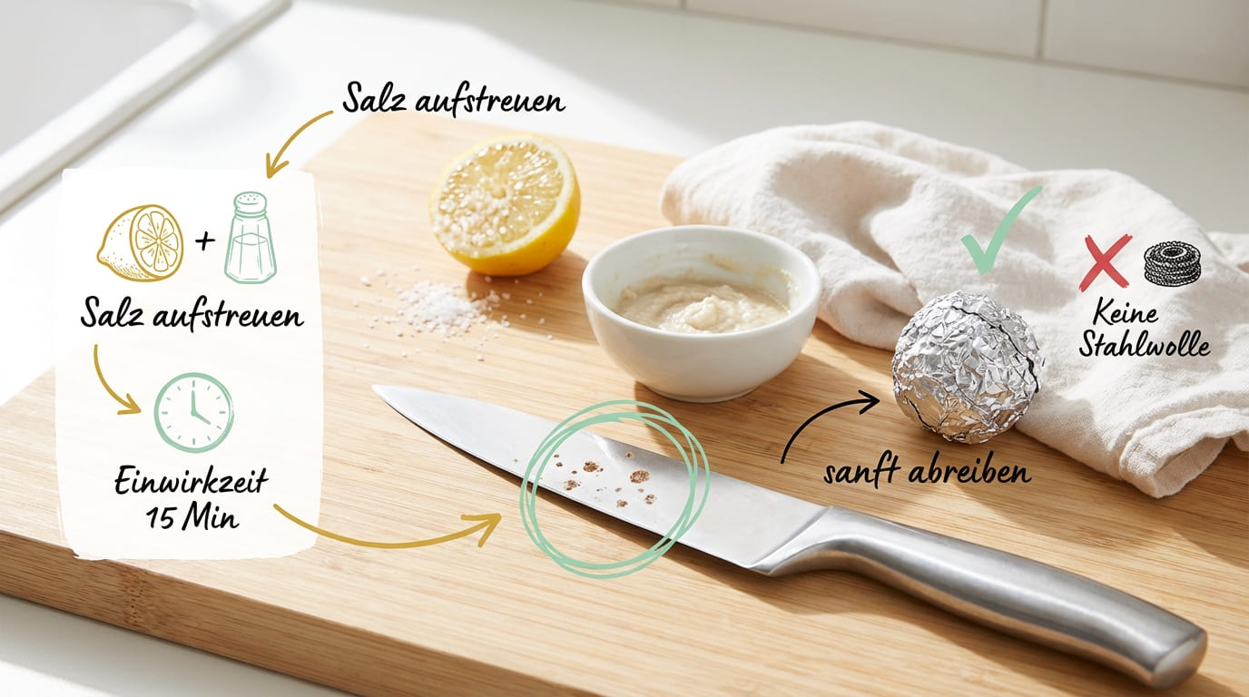 | Zitrone & Salz | ✅ Ja | ✅ Ja | ❌ Nein (greift Silber an) | ❌ Nein (Säure + Abrieb) | ✅ Ja | ⚠️ Nur Klinge behandeln |
