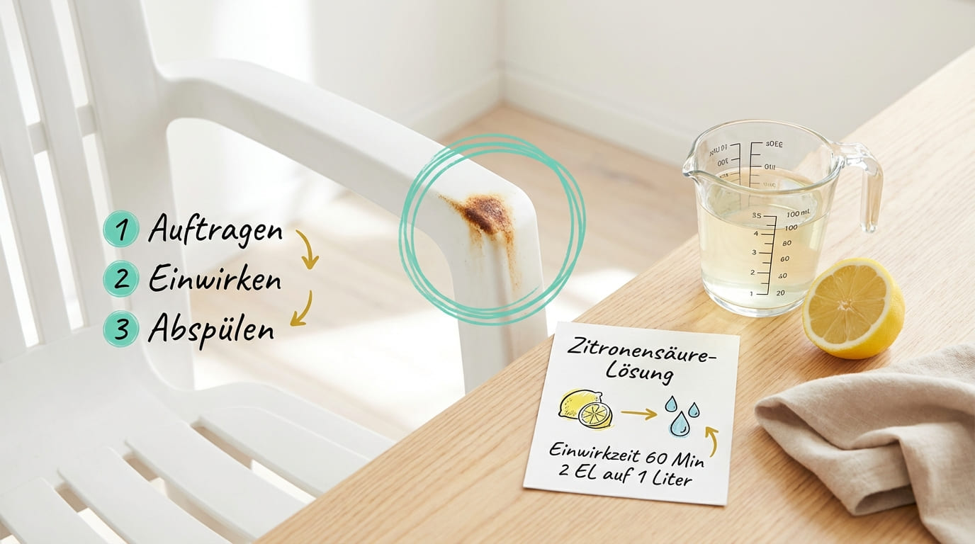 Zitronensäure ist das Mittel der ersten Wahl, wenn du Rostflecken auf Kunststoff entfernen willst. Der Grund: Sie bildet mit den Eisenionen im Rost einen wasserlöslichen Komplex (Fachbegriff: Chelatbildung). Der Rost wird chemisch aufgelöst und lässt sich anschließend einfach abwaschen.