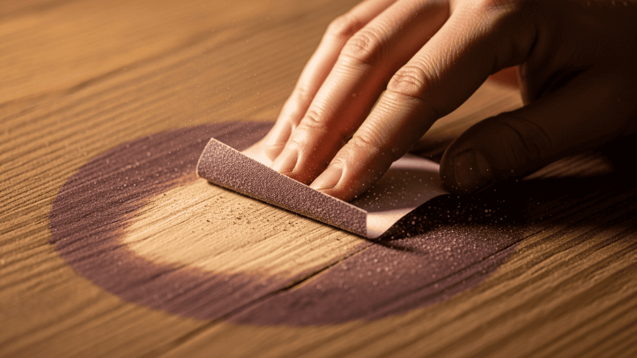 Schritt 3: Bei Bedarf anschleifen. Lässt sich der Fleck nicht vollständig lösen, hilft nur Abschleifen. Verwende feines Schleifpapier (Körnung 180–240) und arbeite vorsichtig, bis die Verfärbung verschwunden ist.