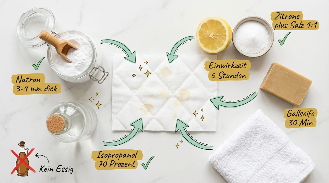 Sauerstoffbleiche (Fleckensalz): 1–2 Esslöffel Sauerstoffbleiche (z. B. Vanish Oxi Action oder Drogerie-Eigenmarke) in 500 ml warmem Wasser auflösen. Ein Tuch eintauchen, auswringen und den Fleck damit betupfen. 1–2 Stunden einwirken lassen, dann mit klarem Wasser nachtupfen. Bei abnehmbaren Bezügen das Fleckensalz direkt ins Waschfach geben.
