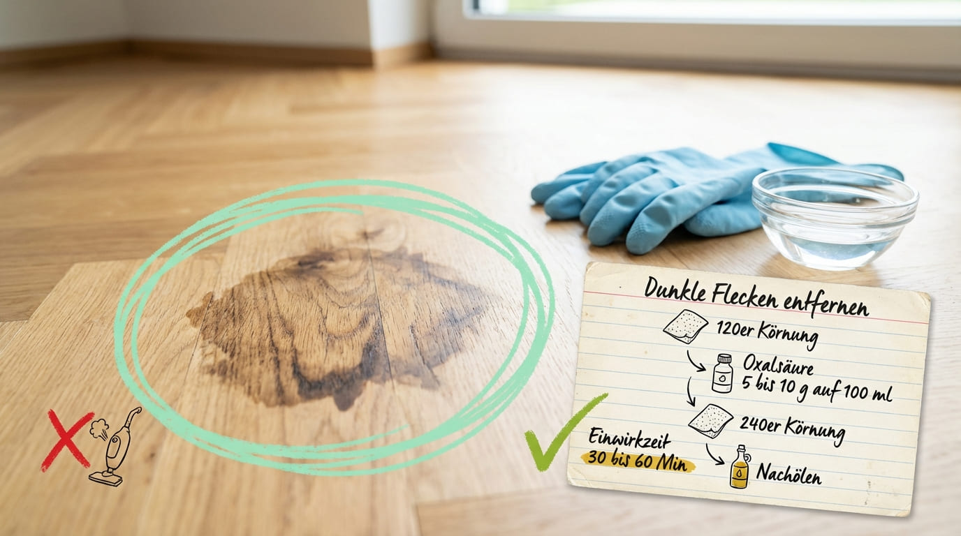 Bei geöltem Parkett: Schleife die betroffene Stelle zuerst mit 120er-Schleifpapier in Faserrichtung an, um die Öl- oder Wachsschicht zu entfernen. Trage dann Oxalsäure (als Lösung nach Herstelleranleitung anmischen – typisch: 5–10 g Oxalsäurepulver auf 100 ml warmes Wasser) oder ein fertiges Gerbsäurespray (z. B. von WOCA oder FAXE) auf die Stelle auf. Einwirkzeit: 30–60 Minuten. Bei Bedarf wiederholen. Danach die Stelle mit klarem Wasser neutralisieren, trocknen lassen, mit 240er-Papier leicht nachschleifen und nachölen.