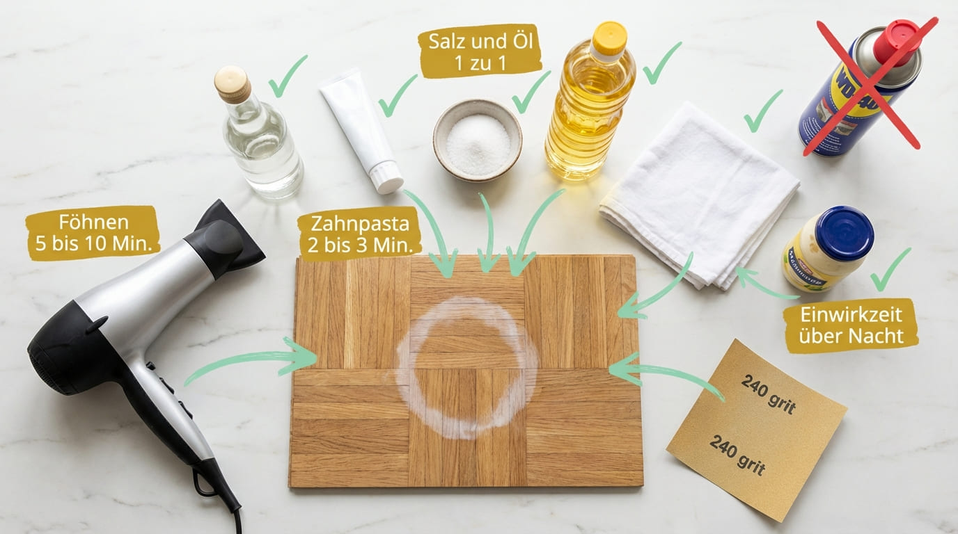 Trage eine großzügige Schicht Mayonnaise (normale Vollfett-Mayo) auf den Fleck auf. Decke die Stelle mit Frischhaltefolie ab, damit die Mayo nicht austrocknet. Lasse das Ganze mindestens 8 Stunden – idealerweise über Nacht – einwirken. Am nächsten Morgen abwischen und die Stelle mit Holzöl nachpflegen.